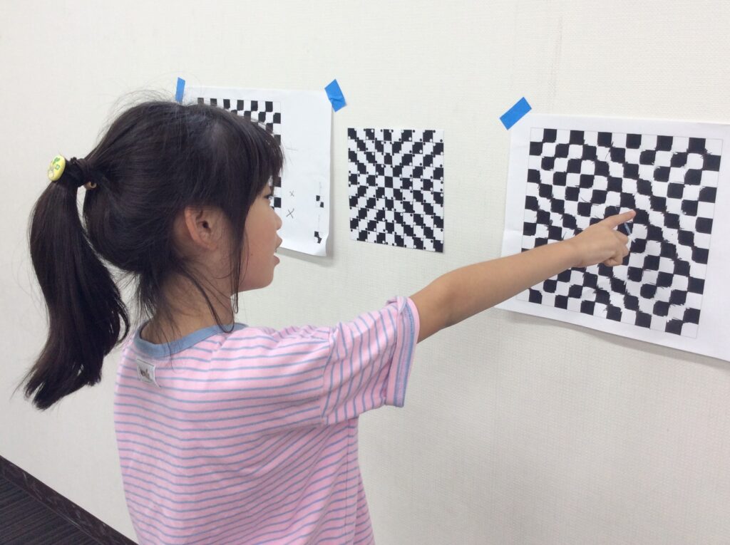 自分たちでシールを貼ったり線を引いたりして“錯覚”を感じて楽しみました♪