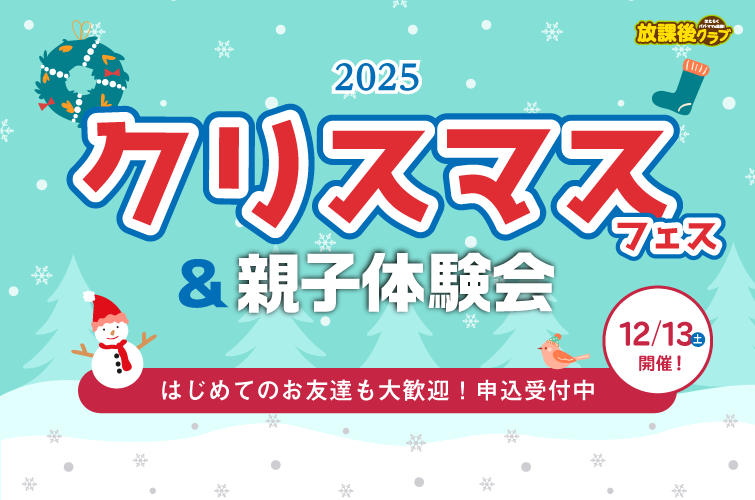 第一部 クリスマスフェスティバル10:00集合 10:15~11:15 色々なゲームや遊びを用意して待っています♪ 第二部 親子体験会11:15~12:00 放課後クラブの人気プログラムを体験できます。 |